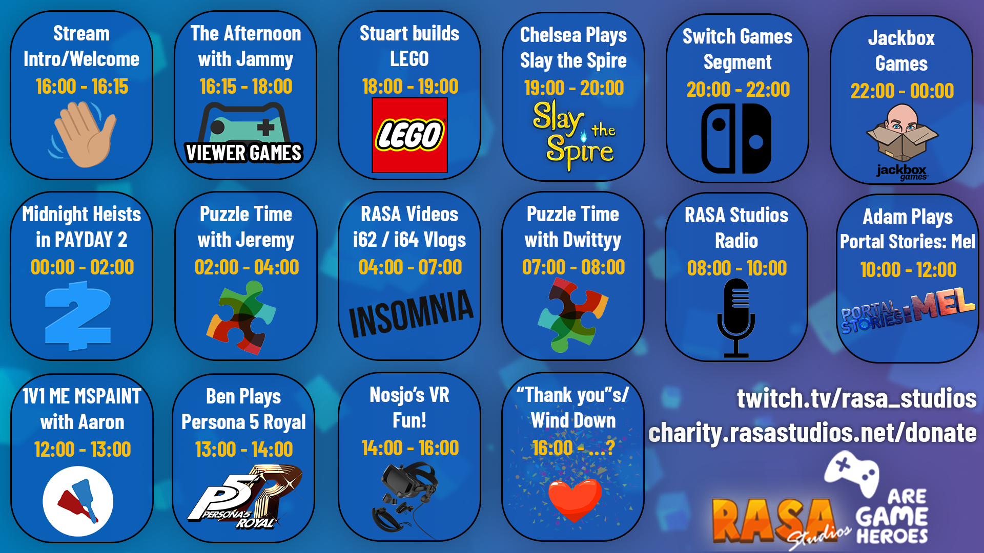 RASA Studios are Game Heroes, in aid of Macmillan Cancer Support, took place on Friday 10th April 2020 at 4pm BST, and ran for 24 hours. We broadcasted to our Twitch channel, and you can find the VODs linked below from our YouTube channel.