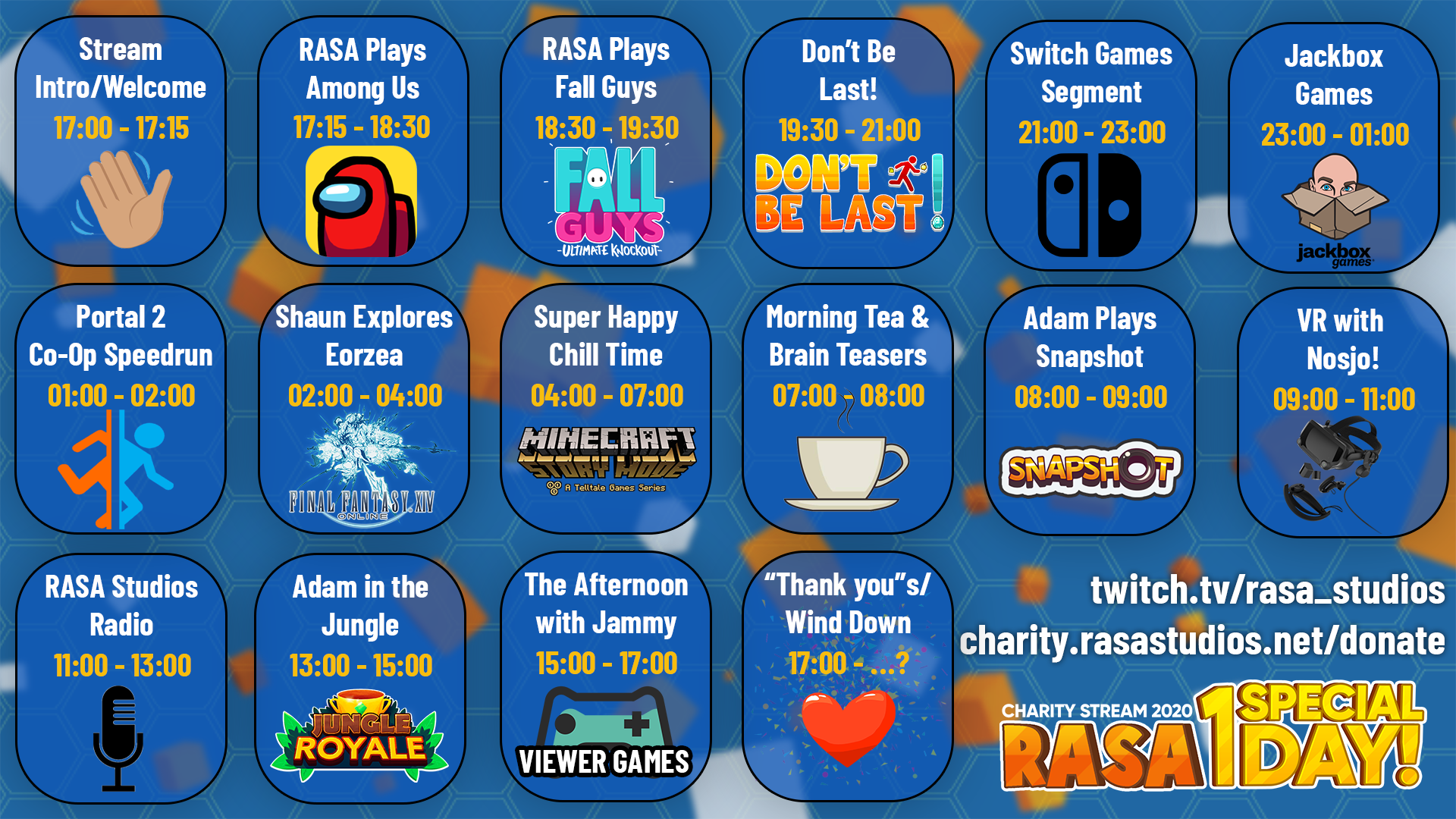 RASA Studios #OneSpecialDay, in aid of SpecialEffect, took place on Friday 2nd October 2020 at 5pm BST, and ran for 24 hours. We broadcasted to our Twitch channel, and you can find the VODs linked below from our YouTube channel.