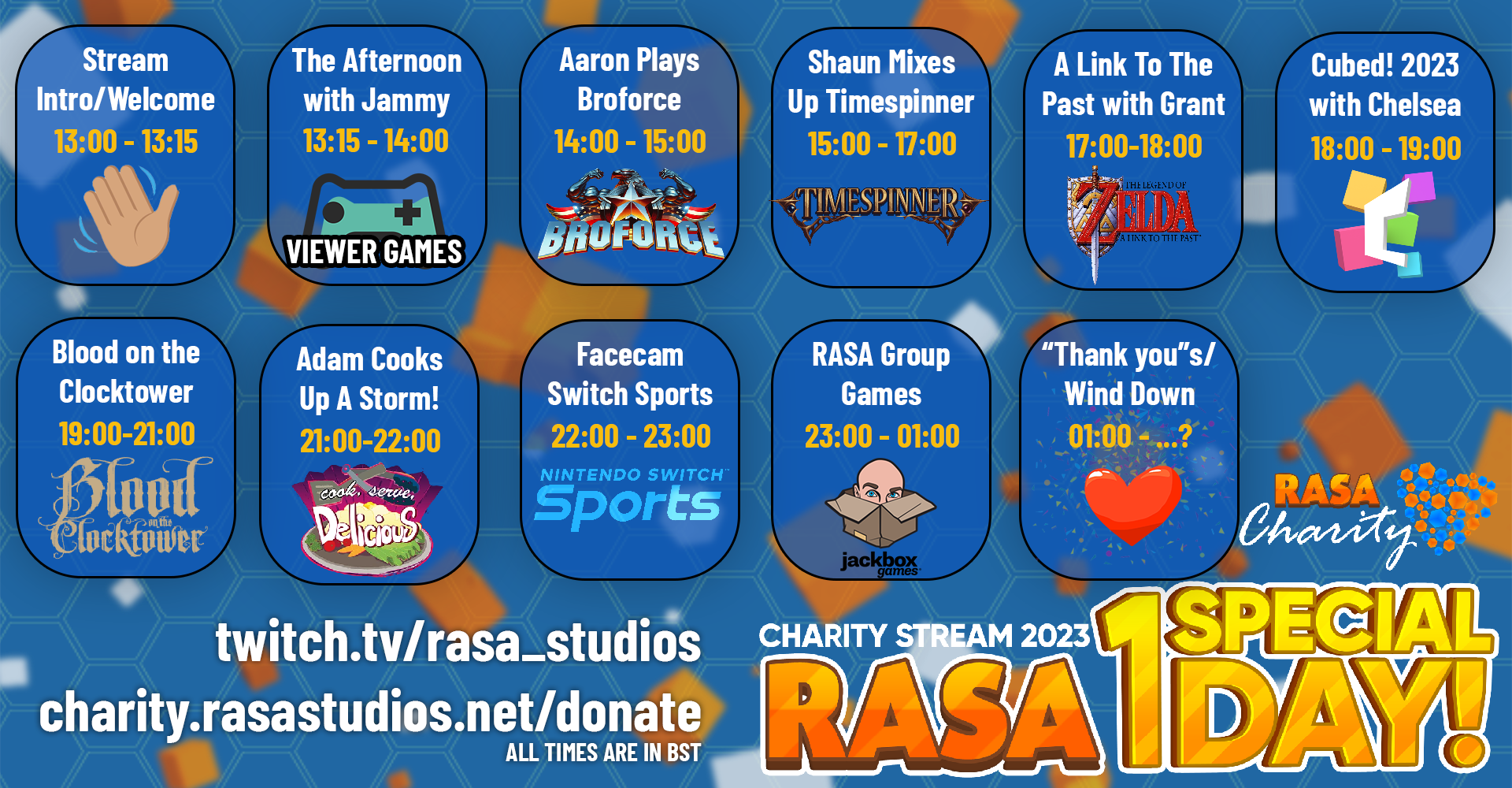 RASA Studios #OneSpecialDay, in aid of SpecialEffect, took place on Friday 6th October 2023 at 1pm BST, and ran for 12 hours. We broadcasted to our Twitch channel, and you can find the VODs linked below from our YouTube channel.
