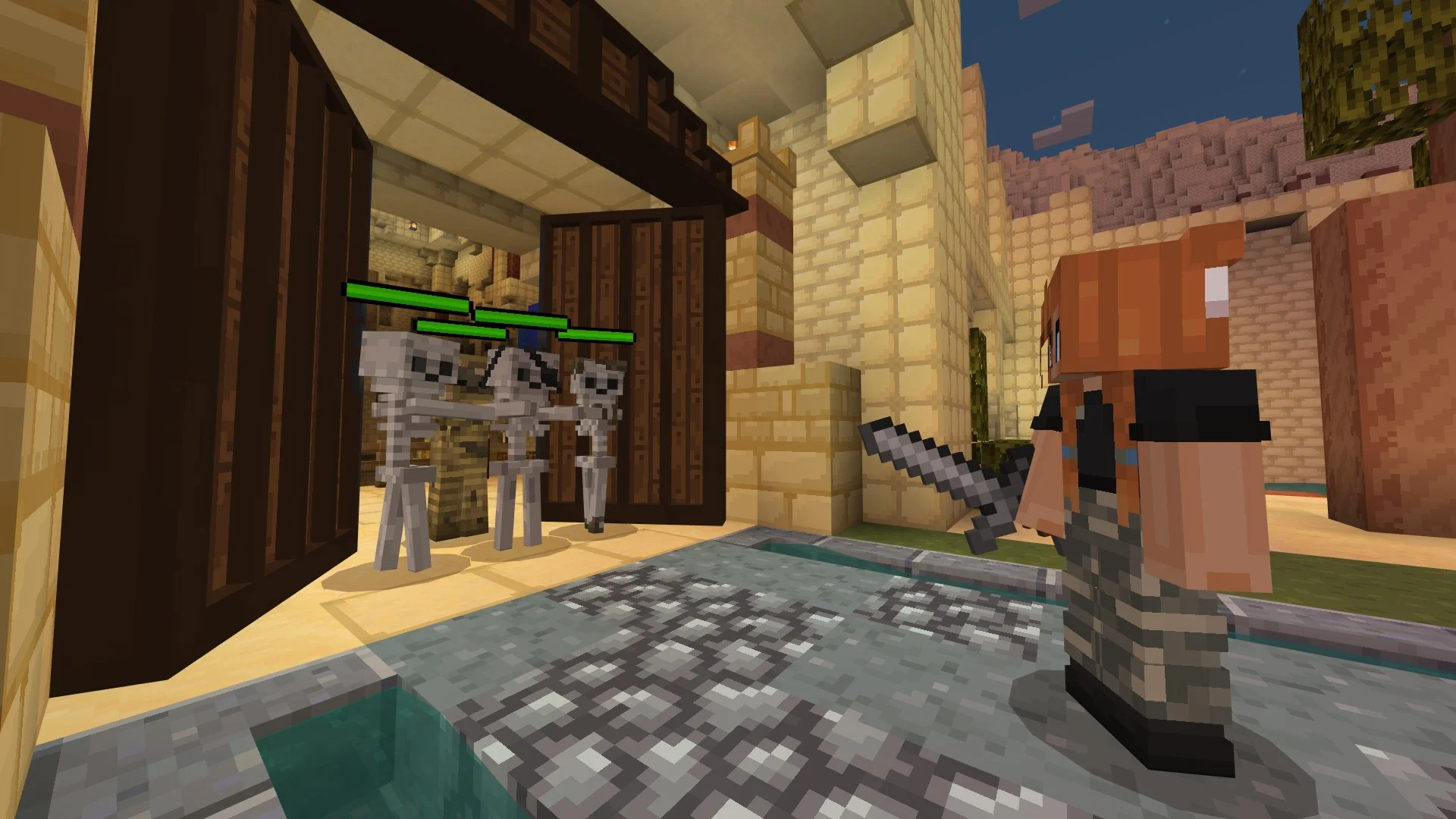 In the lost desert settlement, the undead are coming back to life! Work with friends or yourself to fight off the horde of skeletons, monsters, and bosses to survive for as long as possible. How long can you last in Skeleton Survivors? Play alone, or with friends, in this exciting map - now available on the Minecraft Marketplace!